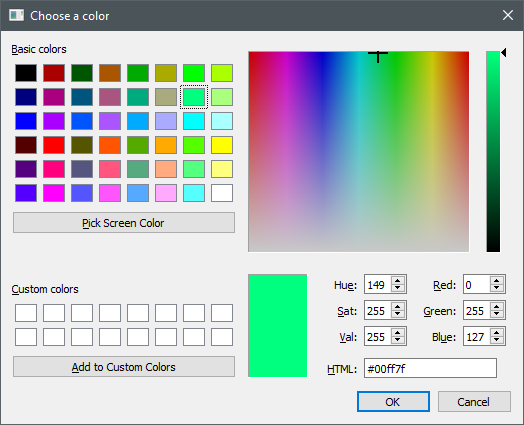 Qt5 support standard dialogs such as QFileDialog, QFontDialog, and QColorDialog, however, it does not provide a color picker to allow a user to pick a color. Recently, I need a color picker for one of my projects and I implemented a simple color picker widget.