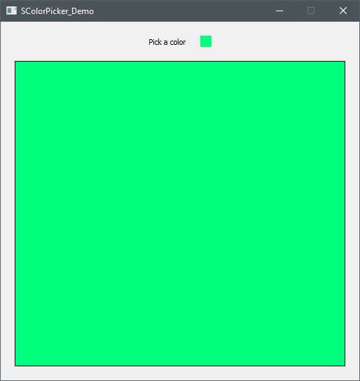 SColorPicker is available from Github as a part of QtUtils repository. To use SColorPicker, add the header and cpp files directly in your project. Then, simply add an instance of SColorPicker in a layout. SColorPicker will appear as 16×16 pixels colored square in the layout. If you need a different size, change it in the SColorPicker's constructor. When a user double-clicks on the colored square, the system’s color dialog will appear allowing the user to choose a color. The selected color can be obtained from color() function or by connecting to colorPicked() signal.